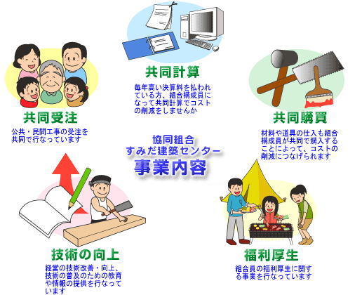私たち協同組合すみだ建築センターは、組合員のみなさんのために必要な事業を行って、組合員の方々が事業活動を活性化することを目的としています。